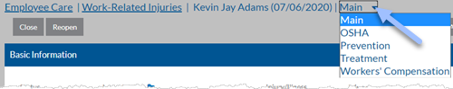 You can track information about injuries that occur to your employees while on the job from the Work-Related Injuries work flow. The information you can track includes OSHA-reportable information along with additional information such as treatment information and workers’ compensation.