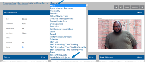 - Select anywhere on the Employee card of the employee you want to see work-related Injuries for.