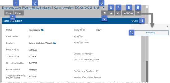 4 Change the status of the work-related injury (if you have security permissions to do so). 5 Add or view any related tasks. A black number badge indicates the number of tasks (both open and completed) associated with it. 6 Add, view or remove watchers. A black number badge indicates the number of watchers already associated with it. 7 Run a report. 8 Create a copy. 9 Open the Options tray. 10 View the change history of it. 11 Edit the work-related injury. When finished editing, select Save (or Cancel to discard changes).