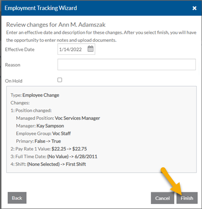Enter the Effective Date of when these changes should take effect, enter a Reason of what the changes are for and then select Finish.