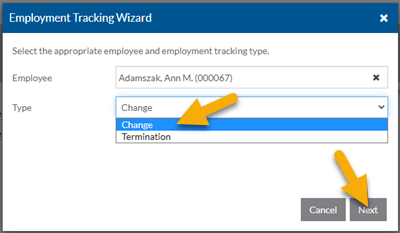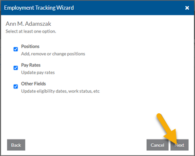 You can use the Employment Tracking Wizard to update an employee's status such as when their position, job title, pay rate, work status or shift changes. Doing so keeps a record of the change on the employee's Employment History card.
