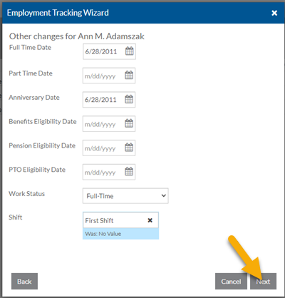 If you selected Other Fields in Step 3, enter the employment related dates, work status, shift and select Next. Otherwise, skip to Step 11.