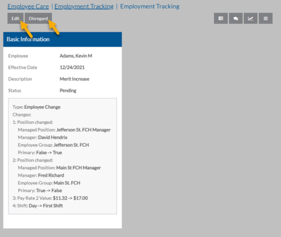 Note: In order to disregard the changes, the user must have workflow security up for employment tracking transactions.