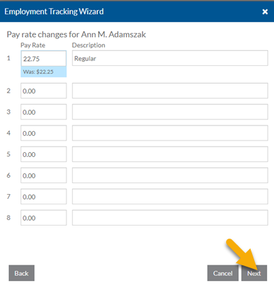 If you selected Pay Rates in Step 3, enter up to 8 new pay rate changes and corresponding descriptions and select Next. Otherwise, skip to Step 10.
