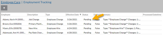 Open the entry to view the changes, make modifications to the changes or disregard it (disregarding it will cancel the change) until it has been processed. Employment Tracking transactions with an effective date of today or in the past will process immediately. Those with an effective date in the future will process sometime between 6:00 AM and 10:00 AM ET on the effective date. The users that have security permissions to run the Employment Tracking wizard will receive a message when items finish processing. If an error occurs, the system will put the Employment Tracking transaction On Hold. If this occurs, the processing message will include information about why the Employment Tracking transaction couldn't process. Once you correct the issue causing the error, you must then edit the Employment Tracking transaction to clear the On Hold check box. Once the On Hold check box is cleared the transaction will then process immediately (if the effective date is in the past or today).