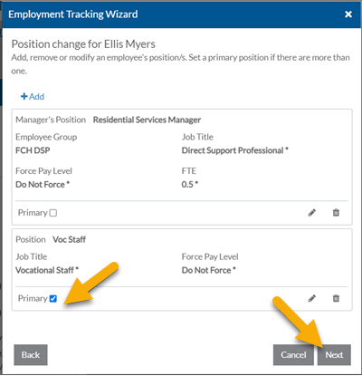 If the employee has multiple positions and managed positions, mark one of them as primary and select Next.
