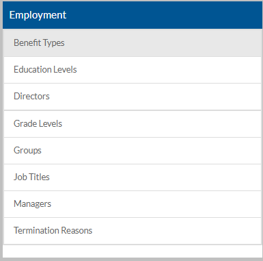 This setup list: Is used here: For: Benefit Types The employee's benefit types for reporting purposed only. Education Levels Employees: Employment: Education