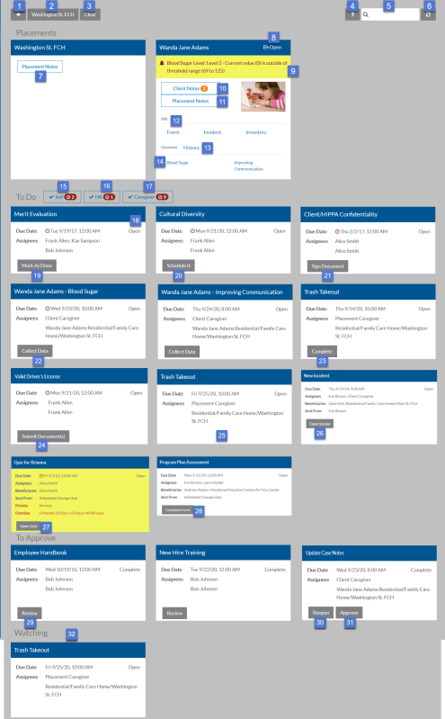 5 Search for a task. 6 Refresh the Task dashboard. 7 If you are a client caregiver, view or enter notes and/or documents and photos for the placement location. 8 If you are a client caregiver, open the client. 9 If you are a client caregiver, a yellow banner appears at the top of the client's card if the data collected triggered an alarm. Click on the yellow banner to view the alarm history. 10 If you are a client caregiver, view or enter notes and/or documents and photos for the client. 11 If you are a client caregiver, view or enter notes and/or documents and photos for the client at the set placement. 12 If you are a client caregiver, add a new event, inventory item or incident for this client.