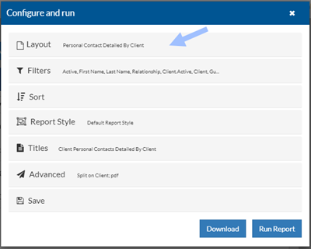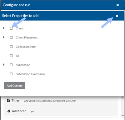 From here you can add, remove and reorder the properties that appear in report layout. See Creating New Reports for details.
