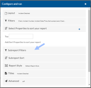 Set or add additional filters for the subreport. See Setting Filters for details on setting filters.