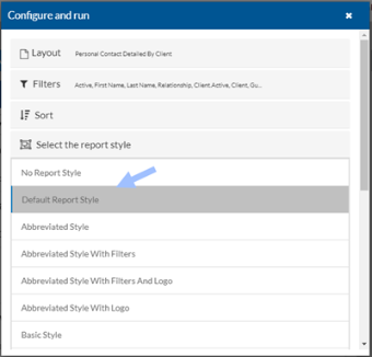Select Default Report Style to use the one set in User Settings/Database Settings, No Report Style to not use a style or select the specific style you want to use.