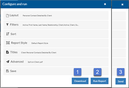 1 Download the report in the selected file format. You will be prompted to select the directory/file name where you want to save it. If you selected a file type other than PDF this will be your only option. 2 If the File Type is set to PDF in the Advanced section, run the report to view it in a new web tab. 3 If you selected Send Email in the Advanced section, the Run Report button will not appear. The only button that will appear will be Send. -