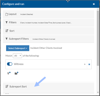 The sort icon next to the subreport indicates that there is already a sort order set for that subreport.