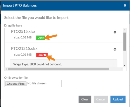 Step Results: When the file has been processed Done will appear beneath it if the import was successful. Otherwise, Errors will appear beneath it. If you click on Errors you can see what caused the import to fail (such as a Staff or Wage Type Code that doesn't exist).