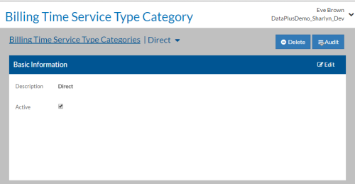 Description Enter a description of the time service type category. This is what staff will see in the list of categories to select from when setting up Billing Time Service Types and setting up Client Overlap flags. Active Select if the time service type category is "in use" and should appear in the list of choices. - Select Save.