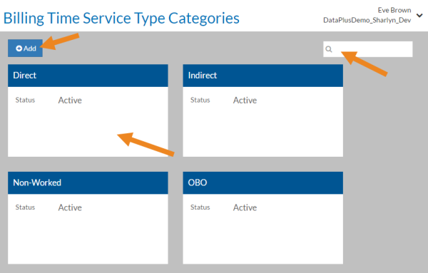Select a billing time service type category card from the list or enter a billing time service type category in the Search box to search for a specific billing time service type category or select Add to create a new one.