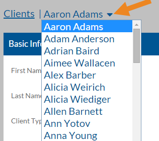 Select the down arrow next to the client's name in the breadcrumbs to switch clients or select Clients in the breadcrumbs to return to the list of client cards.