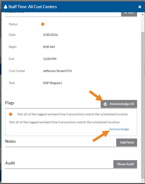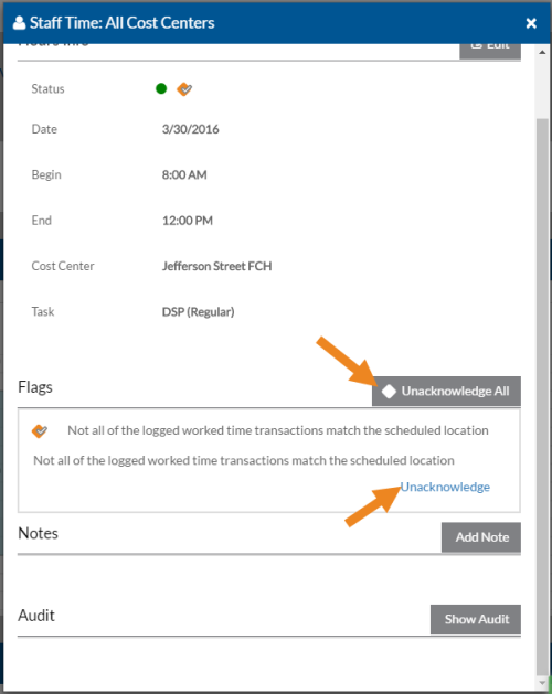 If a transaction has the orange diamond warning flag () on it in the Hours graph or next to it in the Other Hours, Mileage or Expenses grid, then the transaction has a warning flag that needs to be acknowledged (or the warning condition corrected) before the transaction can be approved. Both Review Log and Approve Log Managers can acknowledge and unacknowledge warning flags.