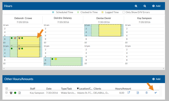 If a transaction has the green circle icon () on it in the Hours graph or next to it in the Other Hours/Amounts or Mileage grid, then the transaction is ready to be approved. Transactions must be approved before they can be exported. Only Approve Log Managers can approve or unapprove transactions.