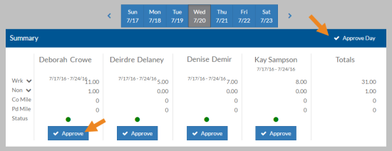 Select Approve under the staff or Approve Day in the banner of the Summary card.