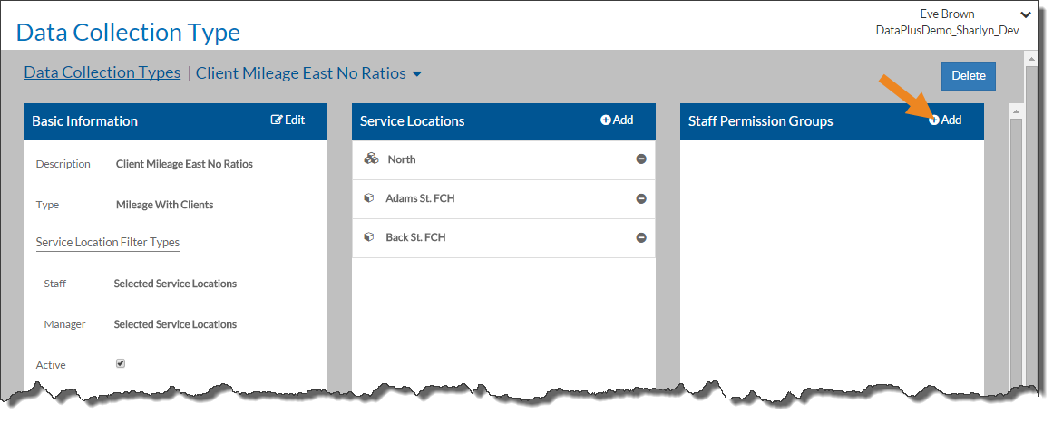 If this is a new data collection type, the Staff Permission Groups and one or more of the following cards may appear depending on the selected Type and filter settings Payroll Cost Centers, Service Locations, Staff Time Wage Types, Mileage Client Services, Staff Time Client Services, Staff Mileage Expense Types, Staff Miscellaneous Expense Types, Census Attendance Prompts, and/or Staff Break Types cards.