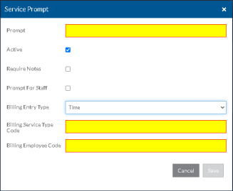 In this field: Enter: Prompt The prompt to be displayed in the Service drop down. Active Identifies this prompt is in use. Require Notes To require a note when adding a new Service entry. Prompt For Staff To show the staff field in the Service entry when this Attendance Prompt is selected. Staff Filter Type If Prompt for Staff is selected, select how you want the list of staff to be filtered: