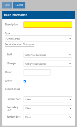 If the Type selected is Client Census, select the primary, secondary and/or tertiary sort order for the Client Census screen.
