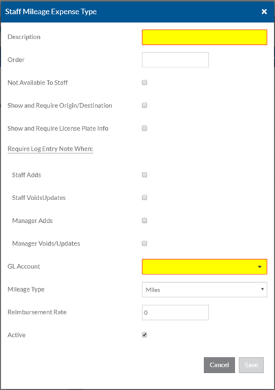 In this field: Enter: Description A description for the staff mileage expense type. This is what staff will see in the list of choices. Order The sort order for this mileage expense type as it will appear in lists. Not Available To Staff Select if only the manager can enter this expense type for the staff. Show and Require Origin/Destination Select to require staff to enter the starting and ending points of their trips. Show and Require License Plate Info Select to require staff to enter the license plate info for the vehicle they are driving for this expense type. Require Log Entry Note When: