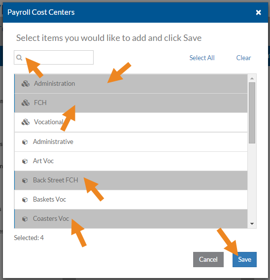 Select the payroll cost centers or payroll cost center groups that you want to assign to this data collection type and then click Save.
