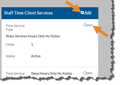 Click Add on the Staff Time Client Services card or select the Open link on an existing Staff Time Client Service card to manage the services and associated settings for this data collection type.
