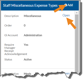 Click Add on the Staff Miscellaneous Expense Types card or select the Open link on an existing Staff Miscellaneous Expense Type card to manage the staff miscellaneous expense types and associated settings for this data collection type.