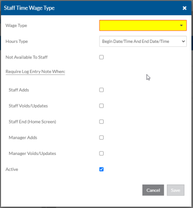These check boxes when selected will require the staff and/or manager to enter a note when adding a new log entry, ending an entry for the home screen, or voiding/updating and existing log entry for this service. Active This wage type is in use. The new Staff Time Wage Type card appears on the Staff Time Wage Types card.