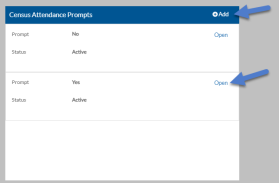 Click Add on the Census Attendance Prompts card or select the Open link on an existing prompt card to manage the prompts and associated settings for this data collection type.
