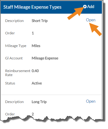 Click Add on the Staff Mileage Expense Types card or select the Open link on an existing Staff Mileage Expense Type card to manage the staff mileage expense types and associated settings for this data collection type.