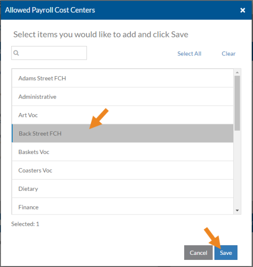 Select the applicable Payroll Cost Center(s) to associate with this device and then select Save.