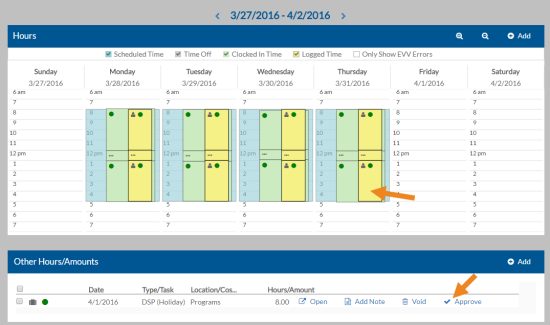 Note: If you do not see the Approve button on a day or the Approve Week link, either there are no transactions ready to be approved or you do not have security permissions to approve.
