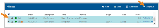 Select the check boxes next to the transactions in the same grid (Other Hours/Amounts, Mileage or Expenses) that you want to approve and click Approve in the toolbar.