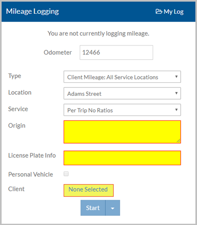 If required to enter the begin and end odometer for mileage, staff can do so from the Mileage Logging card on the Home screen. Review Log and Approve Log Managers can only add mileage with clients that require the begin and end odometer for their staff from the Mileage grid on the Staff Log or Service Location Log screen. See From the Mileage Grid.