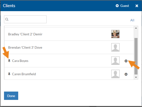 The guest clients appear with a push pin next to their names in the Clients list. You will then need to select them if they are being transported. The guest clients remain on the Clients list as choices until you remove them. - Select the - icon to remove a guest client from the list.