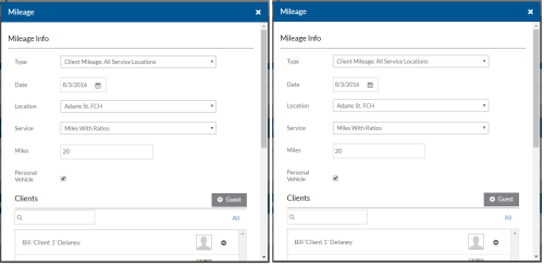 The service selected can change whether or not total miles or the beginning and ending odometer readings are required. The service also determines if the client mileage entry can have multiple clients (using client ratios) or no clients (indirect) associated with it as well as whether the Personal Vehicle check box is active or not.