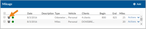 Step Results: The Mileage pop-up closes and Client Mileage Log transaction appears on the Mileage grid. The people icon indicates that it is a Mileage with Clients Log transaction.