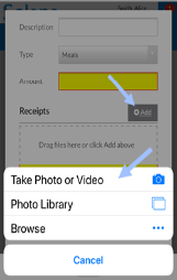 Receipts Select the Add button to add one or more receipts. If you are using a camera-enabled device, you can also take a photo of the receipt to attach to the reimbursement.
