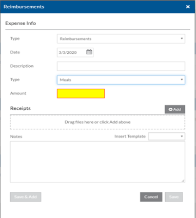 Description A description for this expense. (Expense) Type The type for this expense. This determines whether notes are required, the GL Account/Cost Center to use in the export and whether or not a receipt needs to be submitted to your manager. Amount The amount of the expense to be reimbursed.