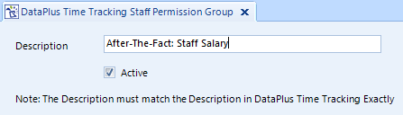 - Enter description for the Staff Permission Group exactly as it appears in Time Tracking.