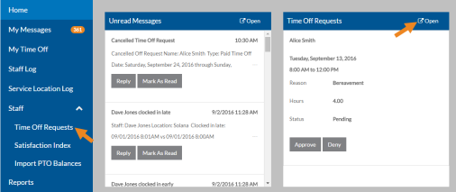 Select Time Off Requests under Staff in the menu or select the Open link on the Time Off Requests card on the Home screen.