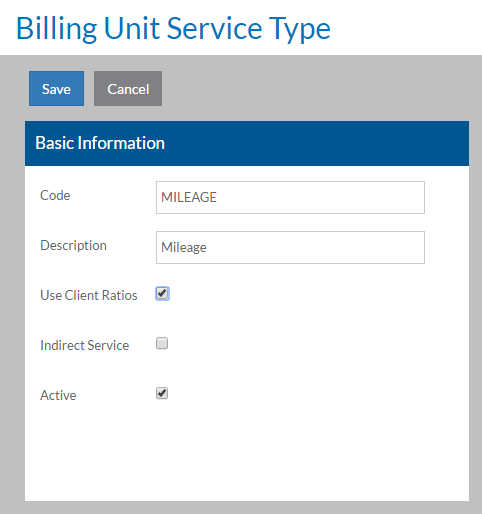 Description Enter a description of the unit service type. This is what staff will see in the list of services to select from. Use Client Ratios Select to use client ratios when entering unit-based transactions with clients for this unit service type. Indirect Service Select if processing Staff Mileage without clients as an indirect service through billing. If selected, Use Client Ratios should NOT be selected. In most cases, this option will not be used as mileage without clients should be logged via Staff Mileage instead. Active Select if the unit service type is "in use" and will appear in the list of choices. - Select Save.