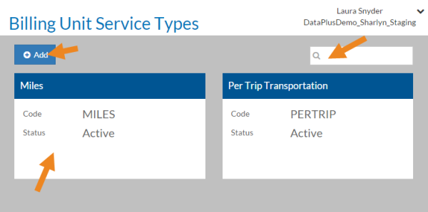Select a billing unit service type card from the list or enter a billing unit service type in the Search box to search for a specific billing unit service type.