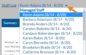The Staff Log Summary is divided into two sections: Managed Staff and Non-Managed Staff. A Staff Log card will appear under Managed Staff if you are that staff's manager for any reason (as a primary, department or backup manager.) A Staff Log card will appear under Non-Managed Staff if that staff has hours logged in a payroll cost center that you manage (but you are not the staff's manager).