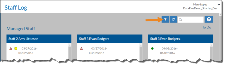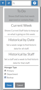You can filter the Staff Log screen to access the Staff Log cards that either need to be approved or have flags that need to be reviewed (To Do), the Staff Log cards for all active staff for the current week (Current Week) or historical Staff Log cards for a specified week or staff member. Additionally, you can filter the Staff Log cards based on whether you are the Primary or Department Manager for the staff or if you are a Backup Manager covering another manager's workload.