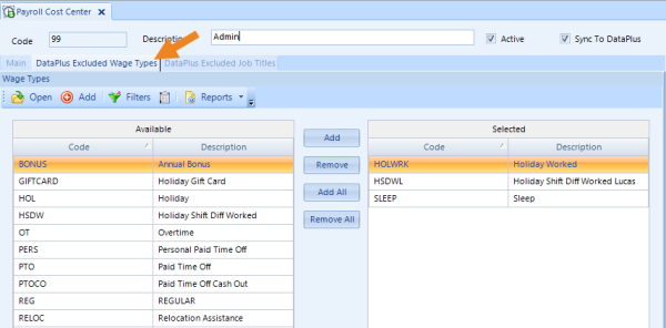 - Select the DataPlus Excluded Wage Types tab to add (or remove) wage types that do not apply to this cost center.